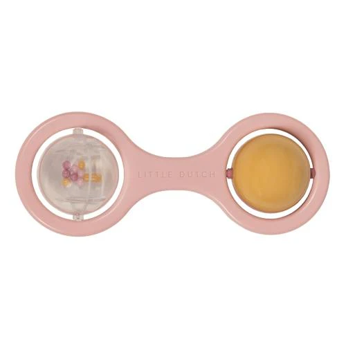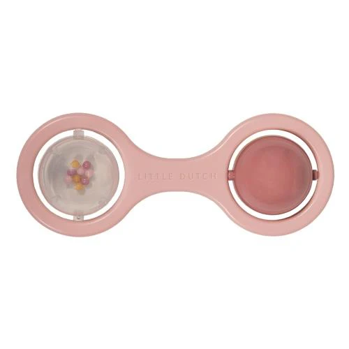 Het is tijd voor wat vrolijke geluidjes. In deze rammelaar zitten twee verschillende ballen. De transparante bal is gevuld met vrolijk gekleurde balletjes. De andere bal is voor de helft roze en voor de andere helft geel. Door aan deze bal te draaien zie je de meest mooie kleurencombinaties. De rammelaar heeft een handvat waardoor je kindje deze goed vast kan houden en er met veel plezier mee kan spelen.