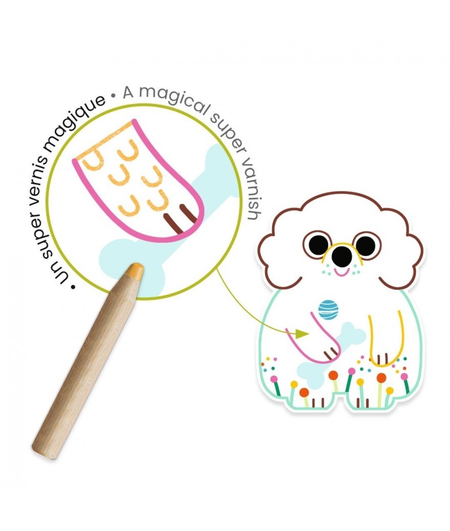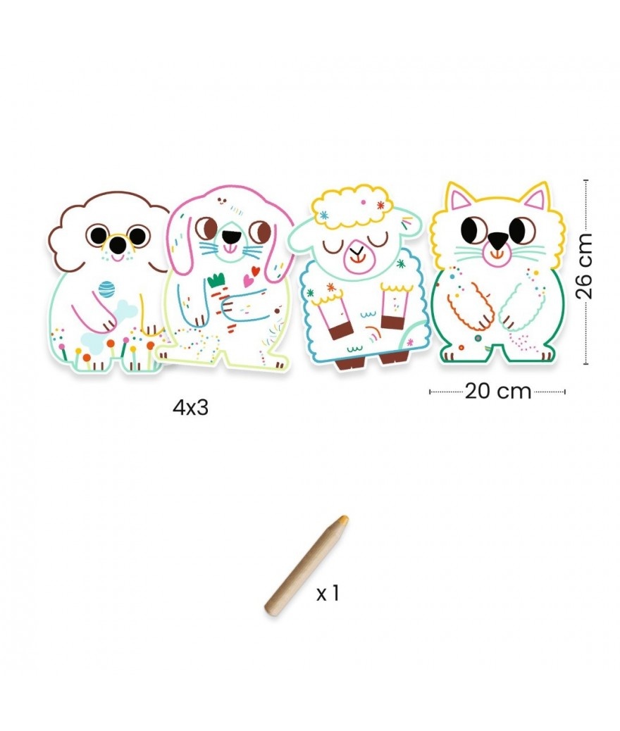 Een mapje met 12 afbeeldingen om in te kleuren met een dik kleurpotlood, geschikt voor kleine kinderhandjes. Het kind kleurt de bekende dieren in met het potlood en ontdekt wat er verborgen zit.