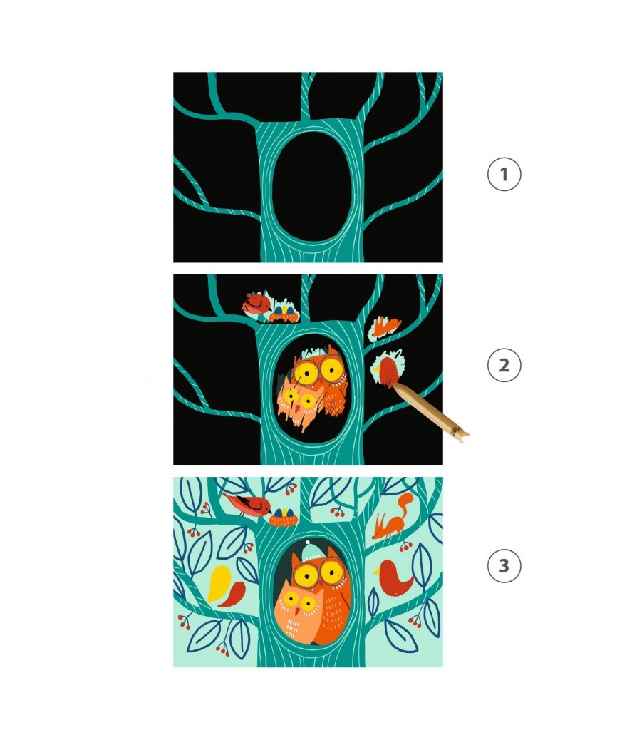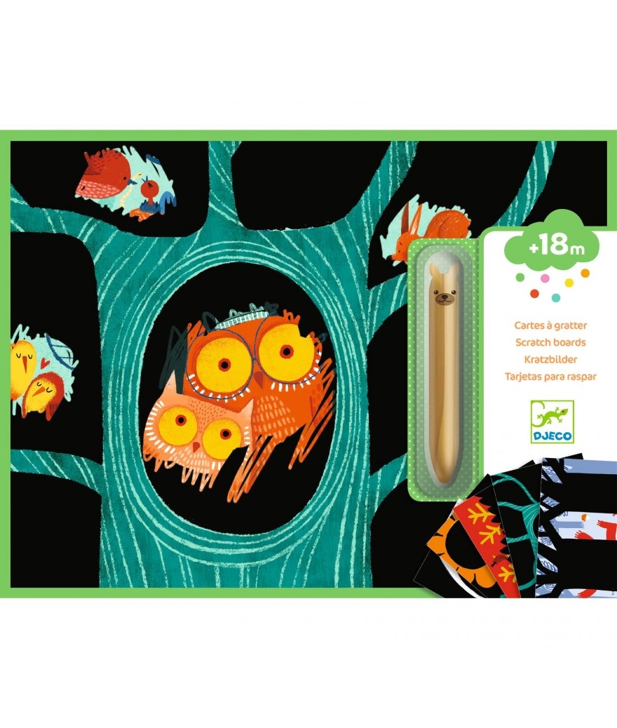 ProductomschrijvingKleintjes hebben ruimte nodig. Daarom 5 grote krasschilderijen met het thema dieren en een houten stokje dat geschikt is voor peuters vanaf 18 maanden.