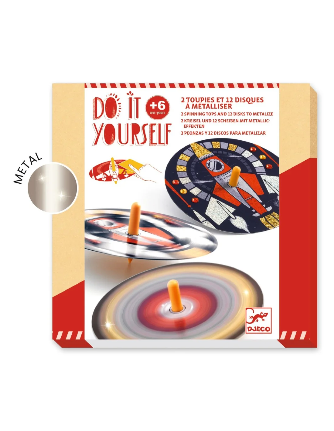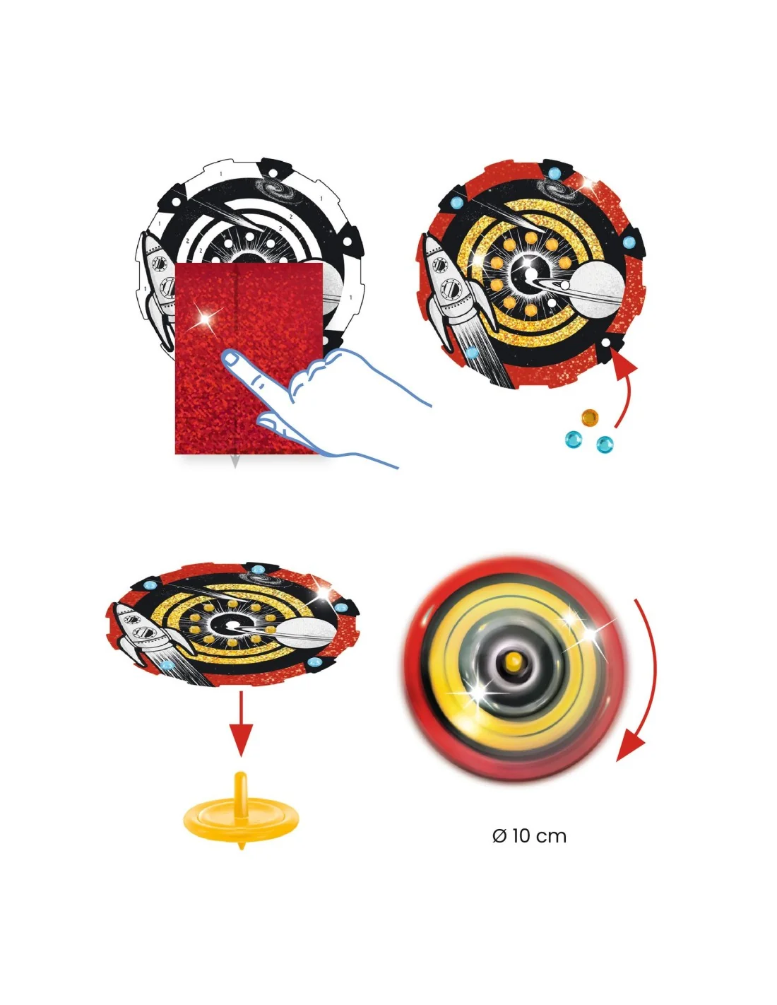 Door de kleurcode op de schijven te volgen, weet het kind waar de metallic glans komt. Hij/zij haalt het gelijmde oppervlak los en legt er dan de metaalfolie op. Het materiaal blijft als bij toverslag kleven! Nu hoeft het kind alleen nog maar zelfklevende strassteentjes aan zijn/haar creaties toe te voegen en de tollen laten draaien om de metallic schitteringen te bewonderen. Het resultaat is hypnotiserend!