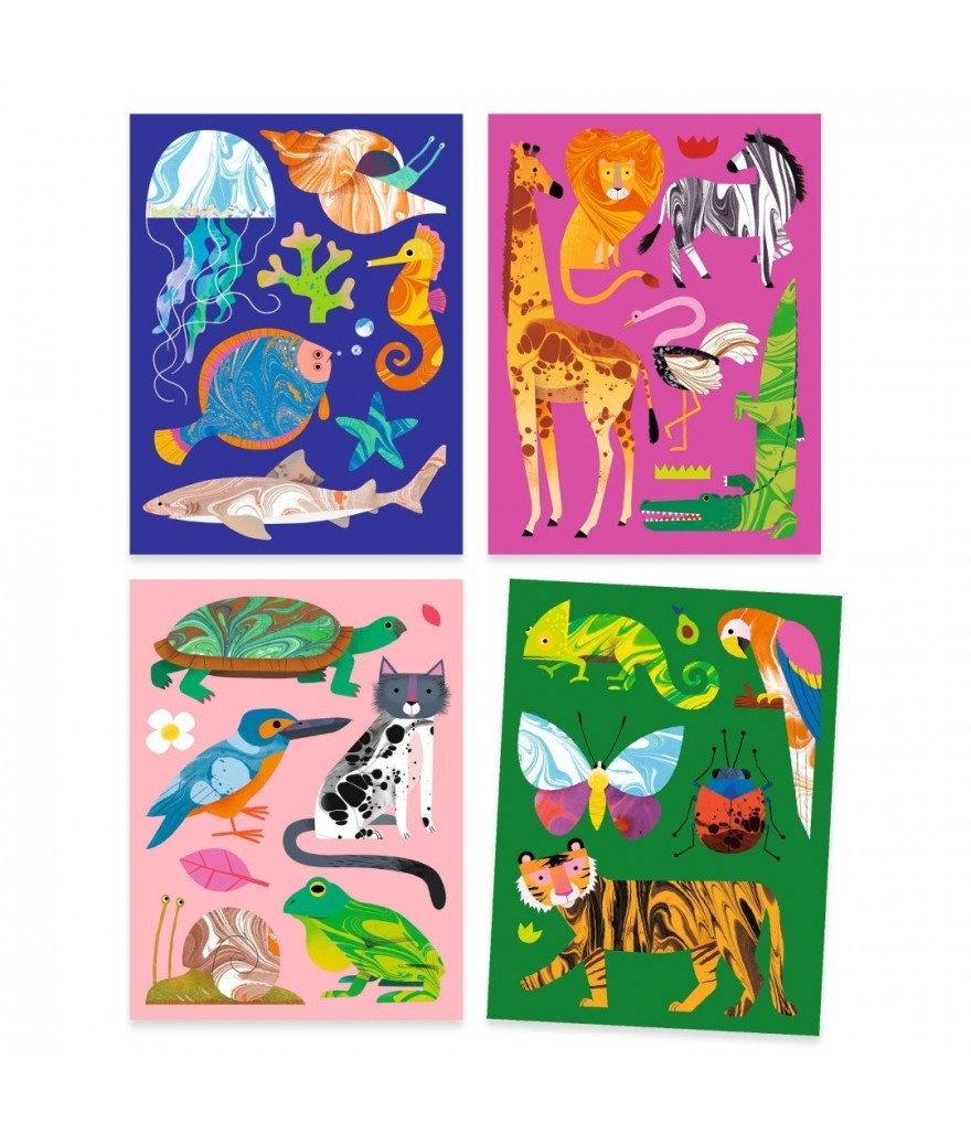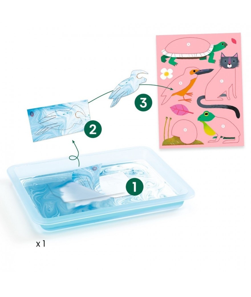 Een activiteit om papier te leren marmeren met gekleurde inkt: het kind maakt de dieren op de 4 plaatjes af met stickers die hij/zij zelf heeft "geprint". Het kind giet de inkt druppelsgewijs in een badje en mengt ze: de kleuren vermengen zich maar lopen niet in elkaar over. Daarna houdt hij/zij de stickers aan het oppervlak van het verfbadje om de patronen op het papier aan te brengen. De gecreëerde patronen worden als bij toverslag op het papier overgebracht!