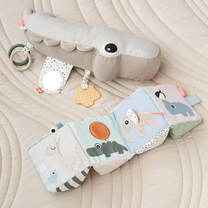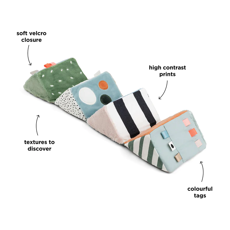 Levendige kleuren en contrasten versterken de visuele stimulatie, en gekreukeld papier zorgt voor intrigerende geluiden. Het uitklapbare sensorische boek kan worden gebruikt voor buiktijd, kruipoefeningen of zittend spelen. Met de klittenbandsluiting sluit je de kubus en maak je er een motiverende dobbelsteen van. Met een elastische lus voor eenvoudige bevestiging aan een kinderwagen of activiteitengymnastiek met behulp van een speelgoedverbinding, combineert deze kubus entertainment- en ontwikkelingsvoordelen voor de ontdekkingstocht en groei van uw baby.