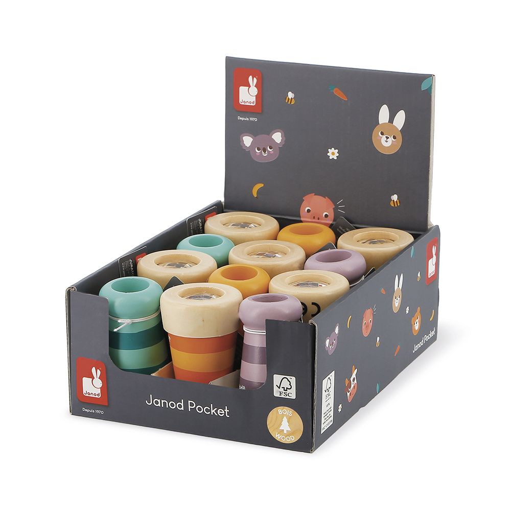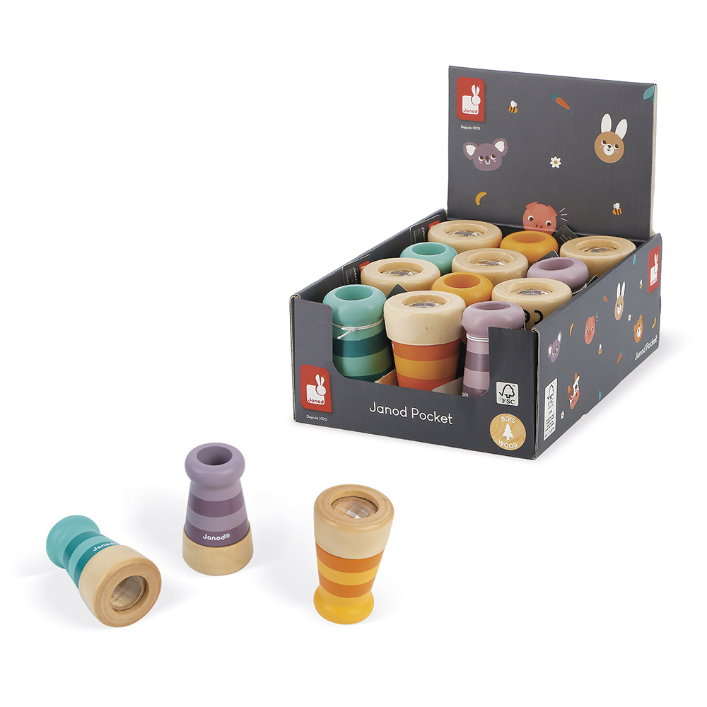 Assortiment van 12 caleidoscopen: 4 stuks van elke kleur (geel, paars, groen). Het kind vermaakt zich met het beeld dat door middel van spiegels meerdere keren wordt gereflecteerd. Wordt in een display verkocht met een etiket aan elke caleidoscoop vastgemaakt. FSC-gecertificeerd. Vanaf 2 jaar.