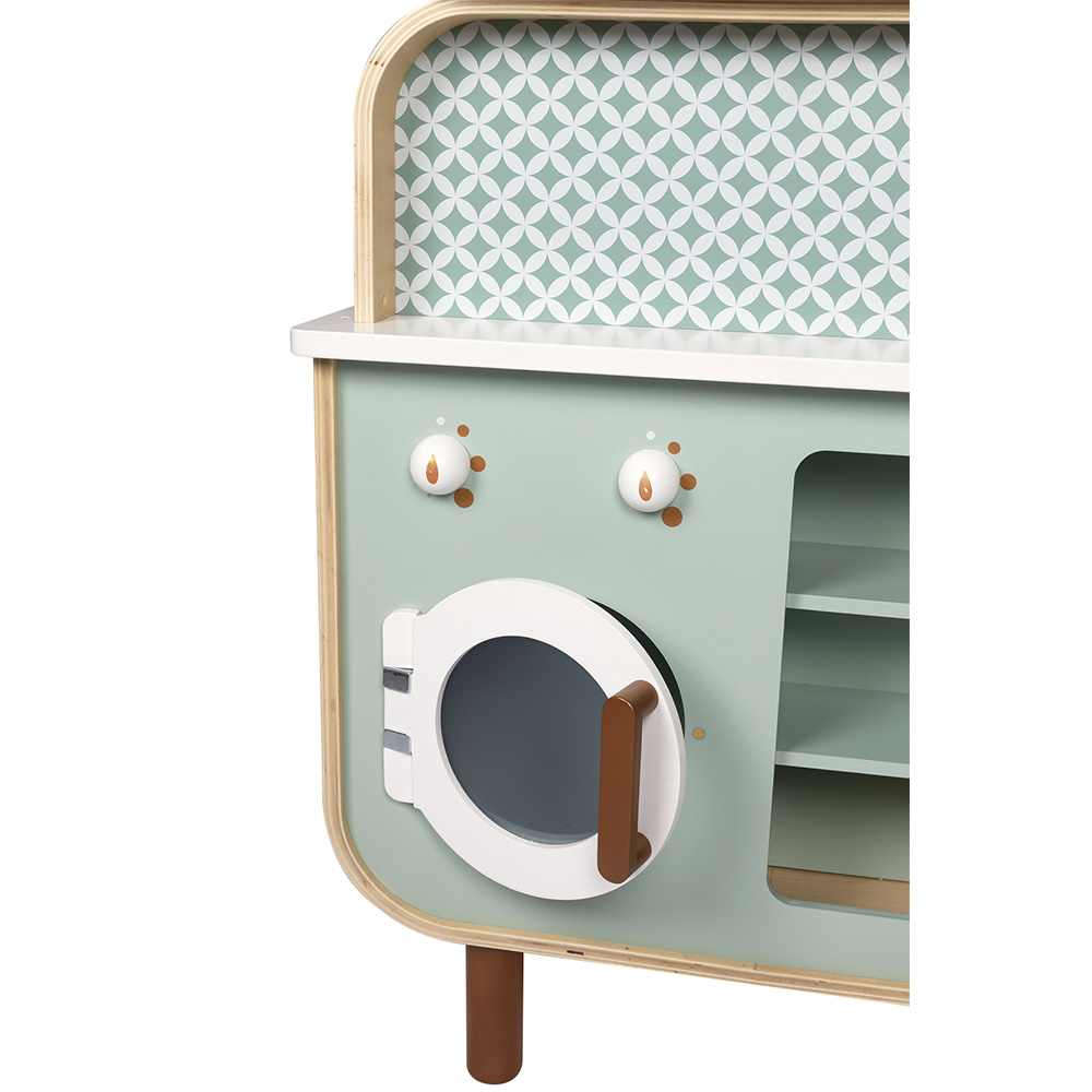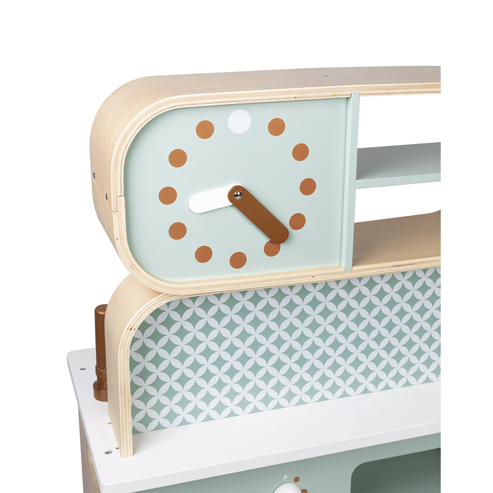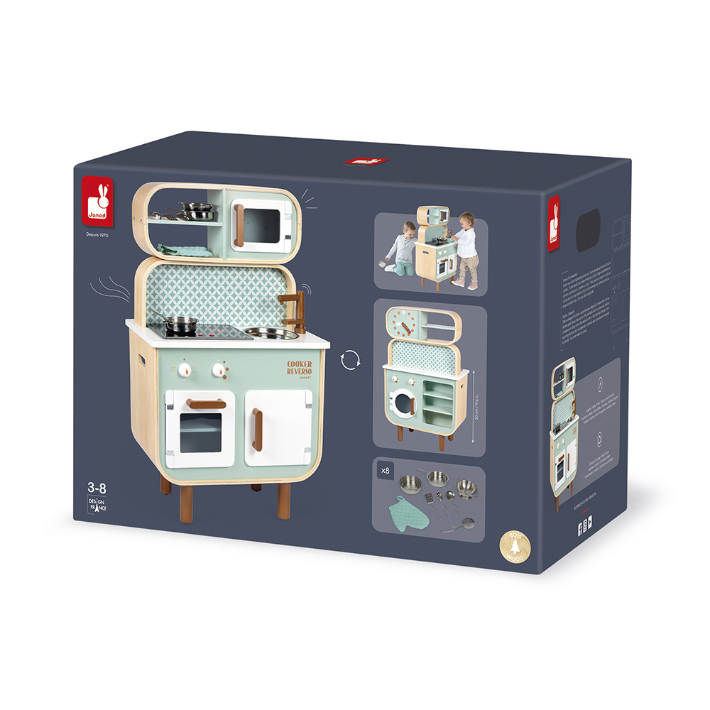 Voor kinderen van 3 tot 8 jaar Zachte kleuren, en een unieke en moderne stijl met leuke functies … de kinderen zullen er zeker van houden! Volledig uitgeruste en dubbelzijdige keuken met meerdere speelmogelijkheden om zowel alleen of samen met anderen te spelen. Een klok met werkende wijzers, een gootsteen van metaal en een inductiekookplaat met licht en geluid. Druk één keer op de rode knoppen om de platen te verlichten en druk een tweede keer om het geluid van kokend water te horen. Het geluid en het licht worden automatisch na 30 seconden uitgeschakeld of wanneer een derde keer op de knoppen wordt gedrukt. Deze keuken is, net zoals een echte keuken, aan één kant uitgerust met 2 draaiknoppen met geluidseffecten, een oven, een magnetron, een muurkast met magneetdeuren en aan de andere kant zijn er 2 knoppen met geluidseffecten, een wasmachine en een opbergrek te vinden. 7 keukenaccessoires van metaal zijn tevens inbegrepen: 1 koekenpan, 1 pan, 1 zeef, 1 lepel, 1 spatel, 1 schuimspaan, 1 pastalepel en 1 stoffen pannenlap. Alles wat uw kleintjes nodig hebben om lekkere gerechten voor u te bereiden! Hoogte van het aanrecht: 50 cm.