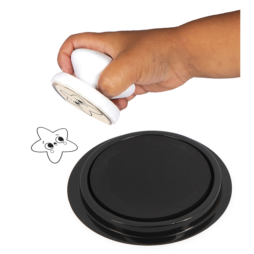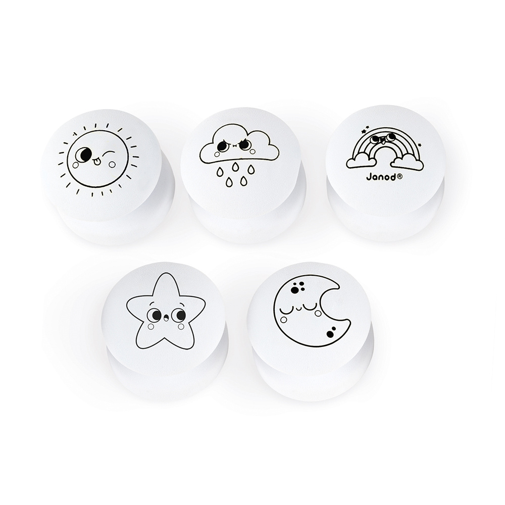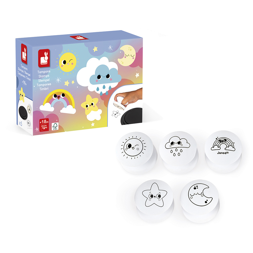 Er was eens, in een droomwereld… een ster, een maan, een regenboog, een zon en een wolk… Laat uw kind mooie verhalen verzinnen en zijn eerste kunstwerken met deze 5 stempels maken. De ergonomische vorm is geschikt voor de kleinste handen. Ideaal voor het ontwikkelen van de fijne motoriek en de verbeeldingskracht. Knutselen voor kinderen vanaf 18 maanden.