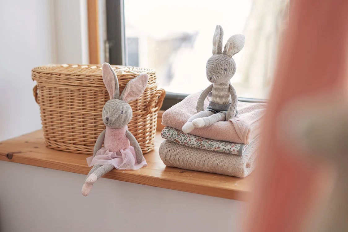 Deze lieve konijnenknuffels met lange benen en lange oren zijn geweldig gemakkelijk vast te pakken vanaf de eerste momenten dat je baby kan grijpen. De konijntjes hebben kleertjes aan die niet uit kunnen. Het is van een andere stof dan het breisel van het konijntje zelf. Deze verschillen in stof en structuur is interessant studiemateriaal voor jouw baby. De knuffels zijn niet alleen geweldig speelgoed voor baby en dreumes, maar ook voor peuters is het leuk! Deze konijnen met kleertjes aan dragen bij aan het fantasiespel van peuters. Leuk voor in bed of de box. Of als decoratie op de babykamer. De knuffels zijn ook een perfect kraamcadeau! Ga jij voor Joey of Nola?