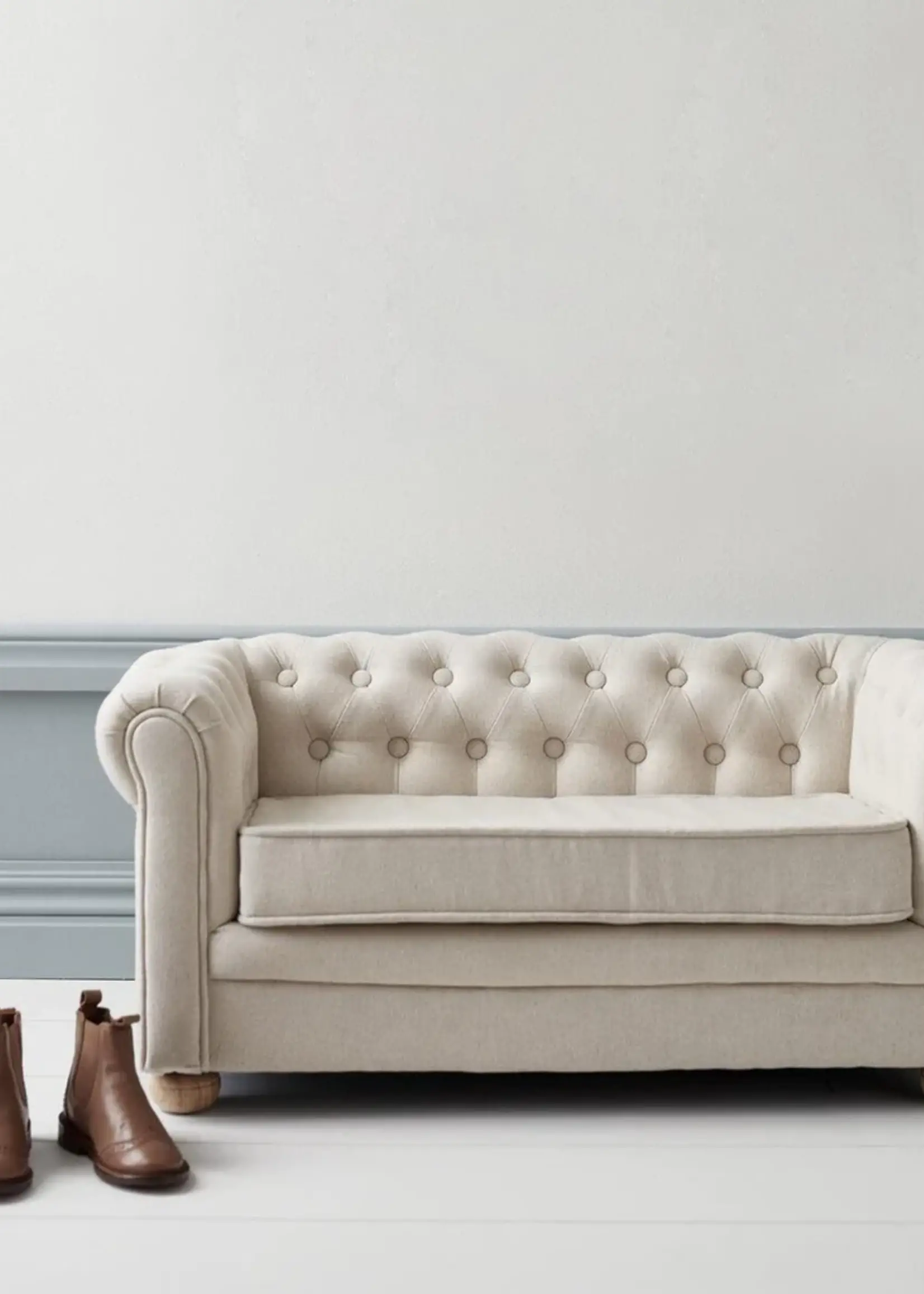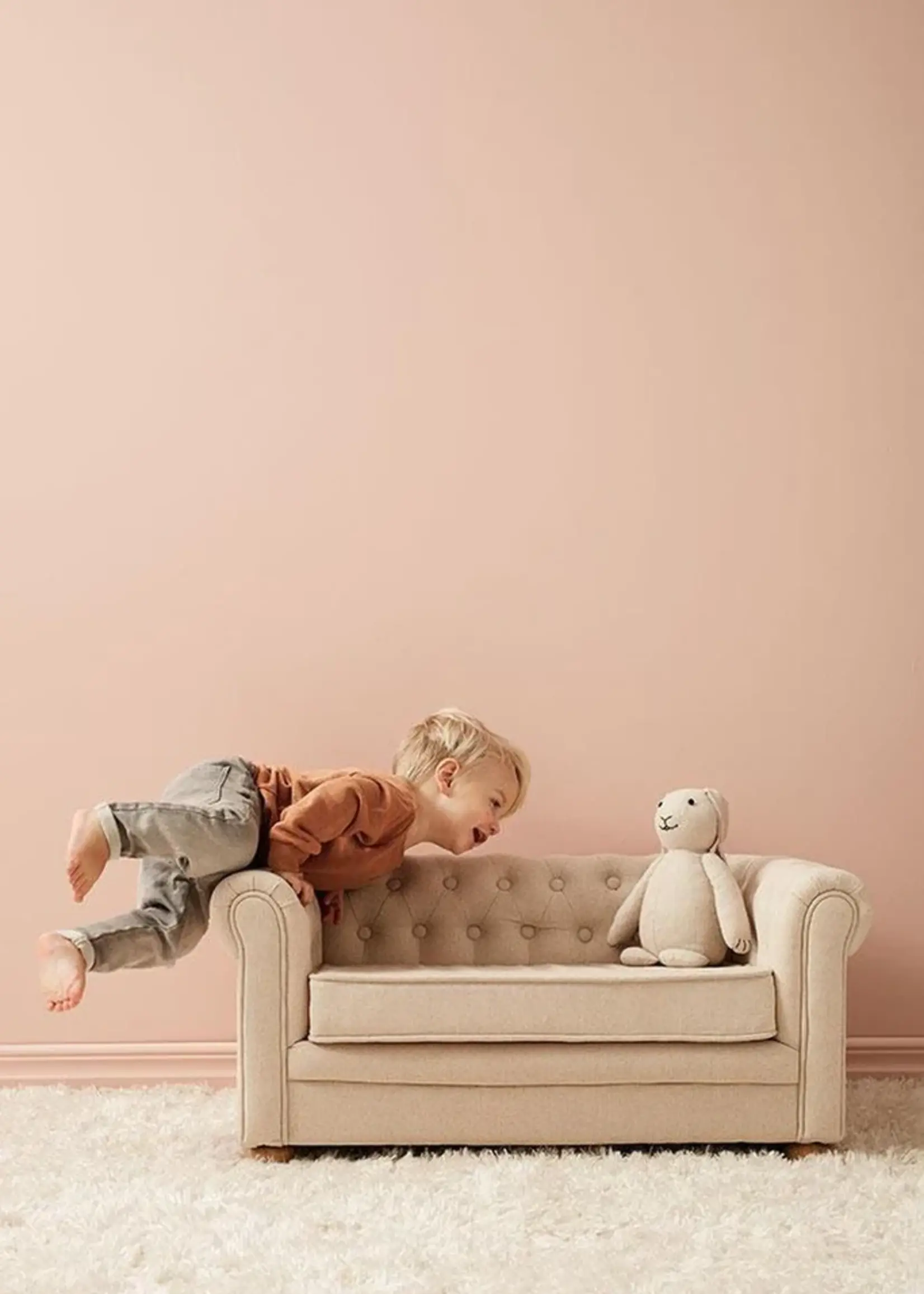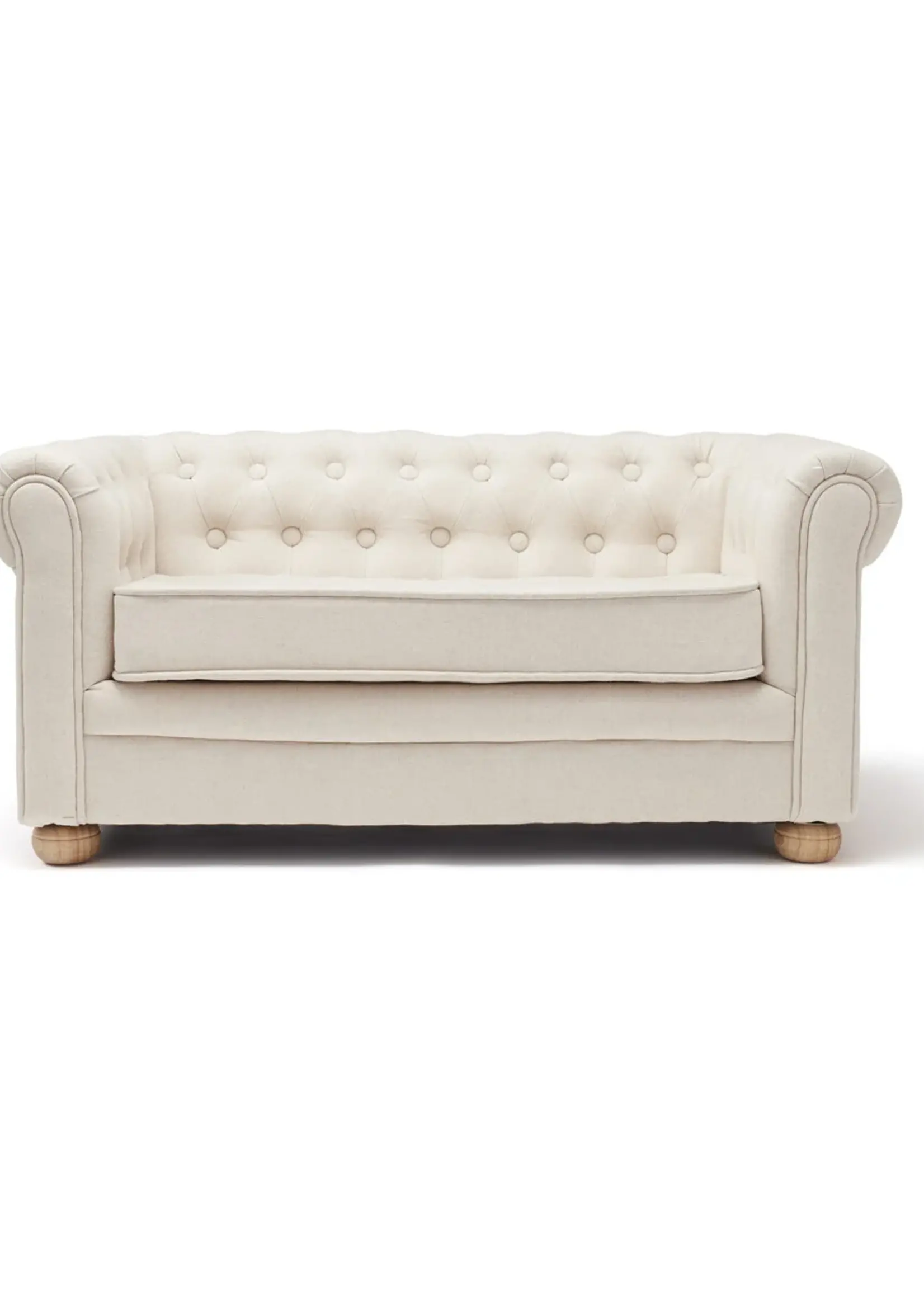 Een klassieke op Chesterfield geïnspireerde kinderbank die net zo goed in de kinderkamer als in de woonkamer past. Net als een typische Chesterfield-bank heeft hij licht uitlopende armleuningen die even hoog zijn als de rugleuning.