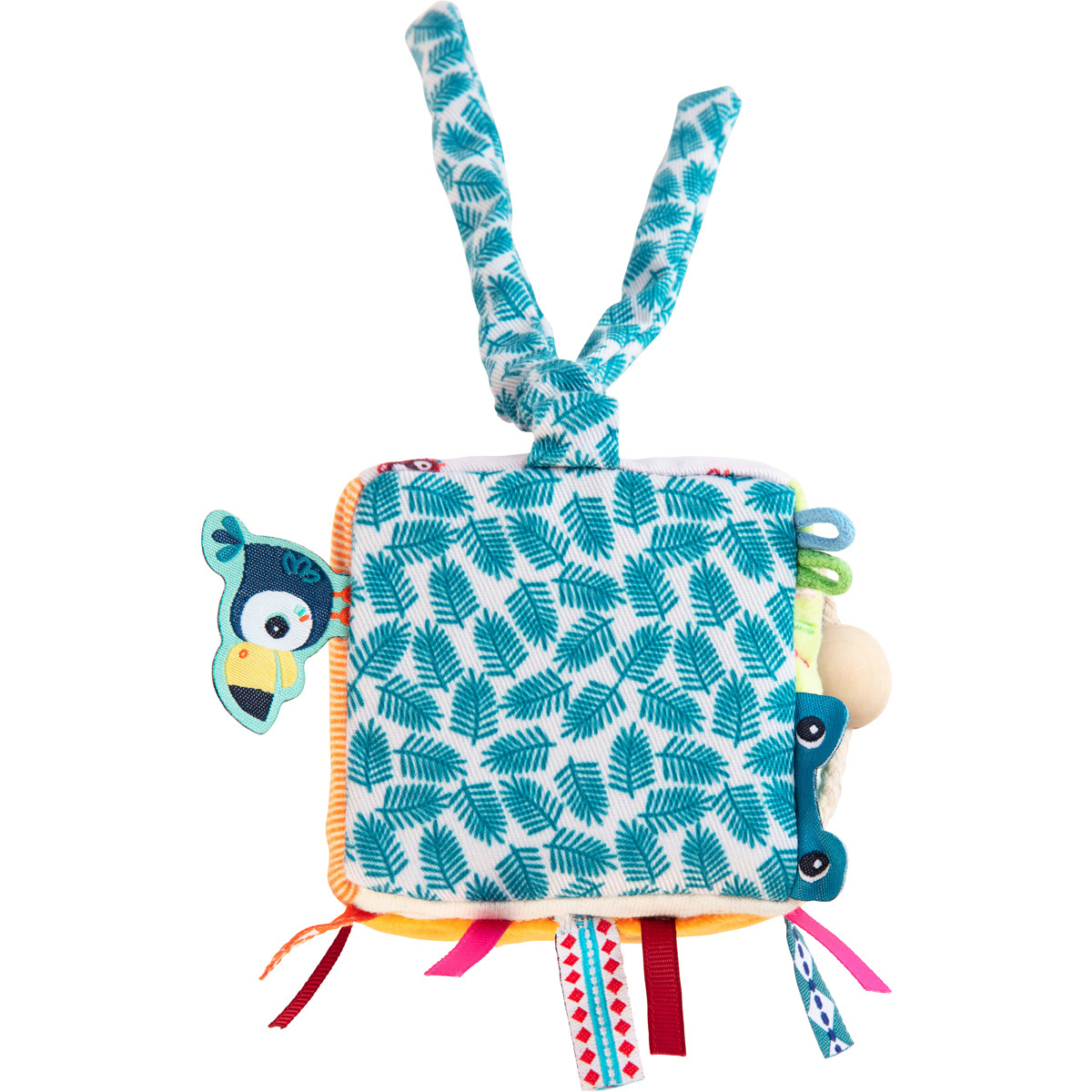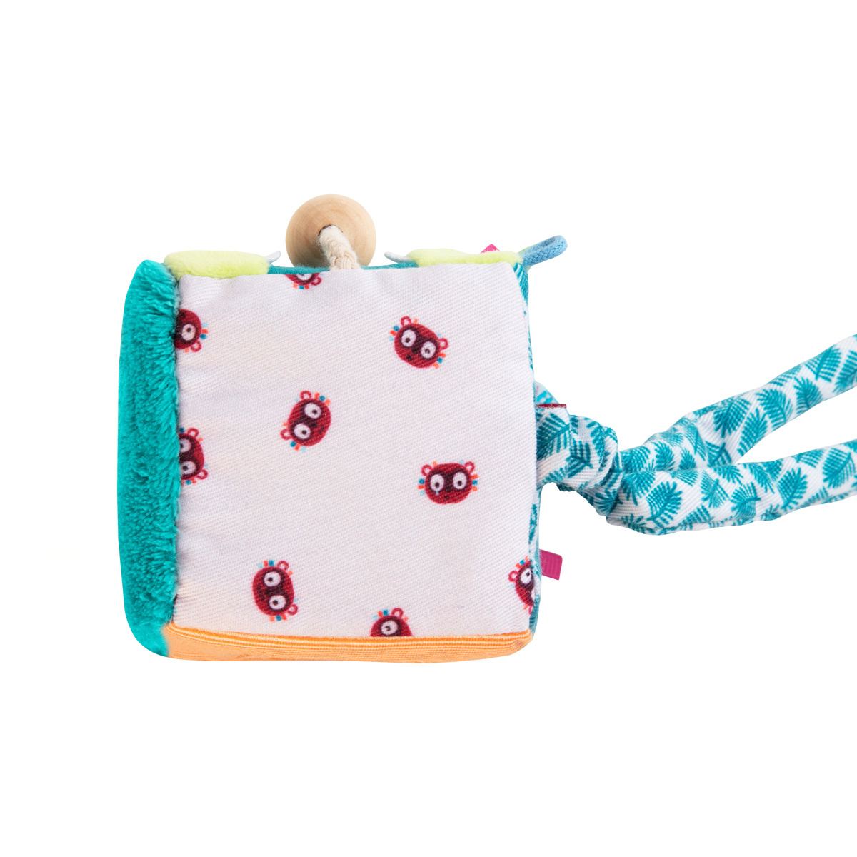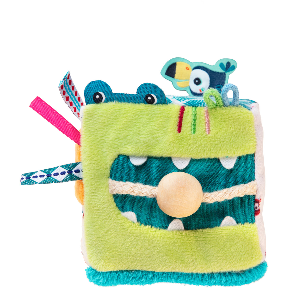 Ontdek de activiteiten en verhaaltjes van deze zachte kubus rond het junglethema. De bijtring biedt verlichting bij doorkomende tandjes.Stimuleert de zintuigen, fijne motoriek en het vastpakken.