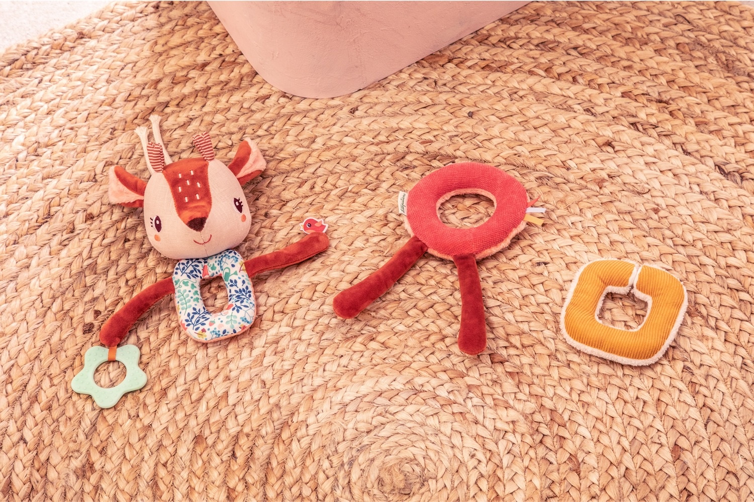 Deze zachte slinger biedt een waaier aan activiteiten die de zintuigen van je kleintje stimuleren. Rammelende of knisperende geluidjes, verschillende materies, een bijtring… zetten de kleintjes aan om op ontdekking te gaan. De ringen van de slinger kunnen losgemaakt worden. Makkelijk te bevestigen dankzij het touwtje.