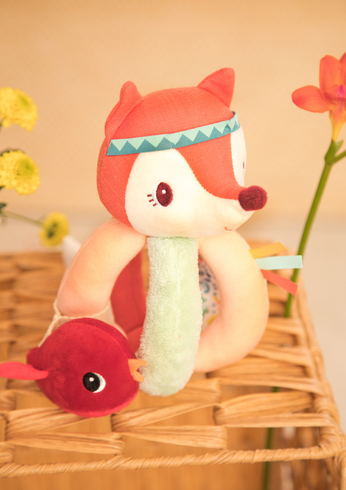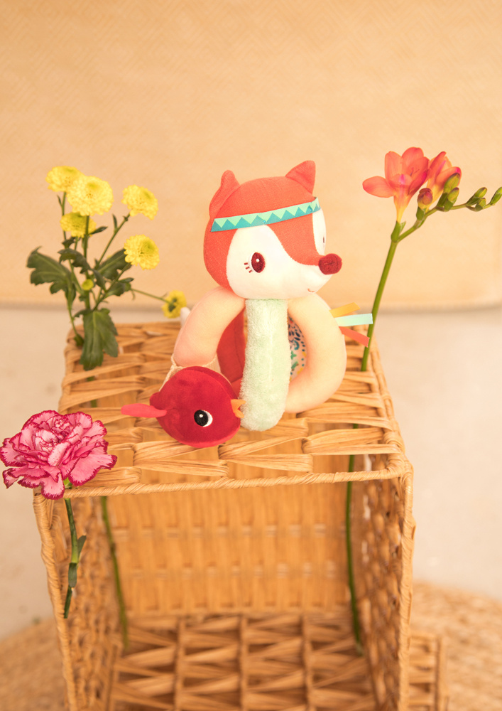 Een originele rammelaar, makkelijk vast te grijpen voor kleine handjes. Een klein vriendje schuilt tussen de handgrepen door.