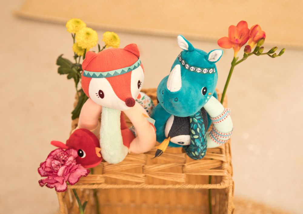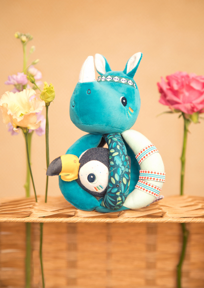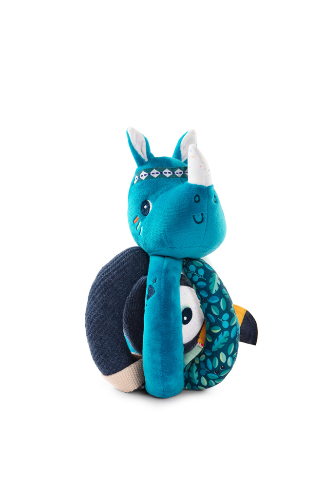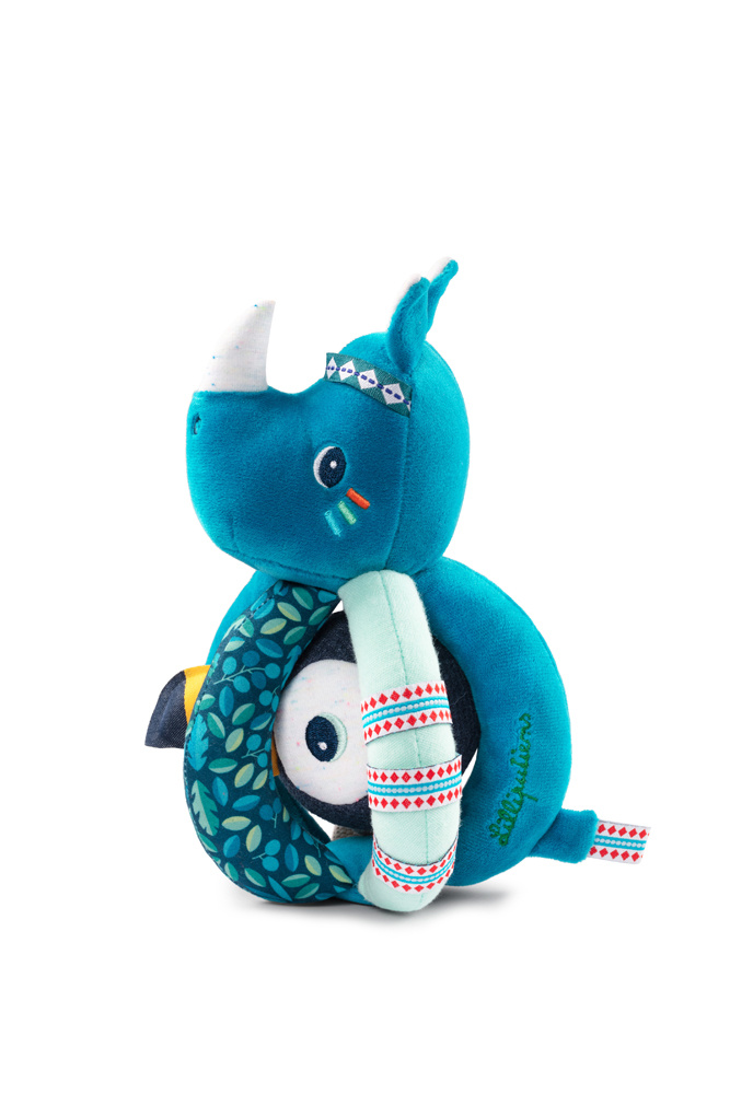 Een originele rammelaar, makkelijk vast te grijpen voor kleine handjes. Een klein vriendje schuilt tussen de handgrepen door. Vanaf 6 maanden.O