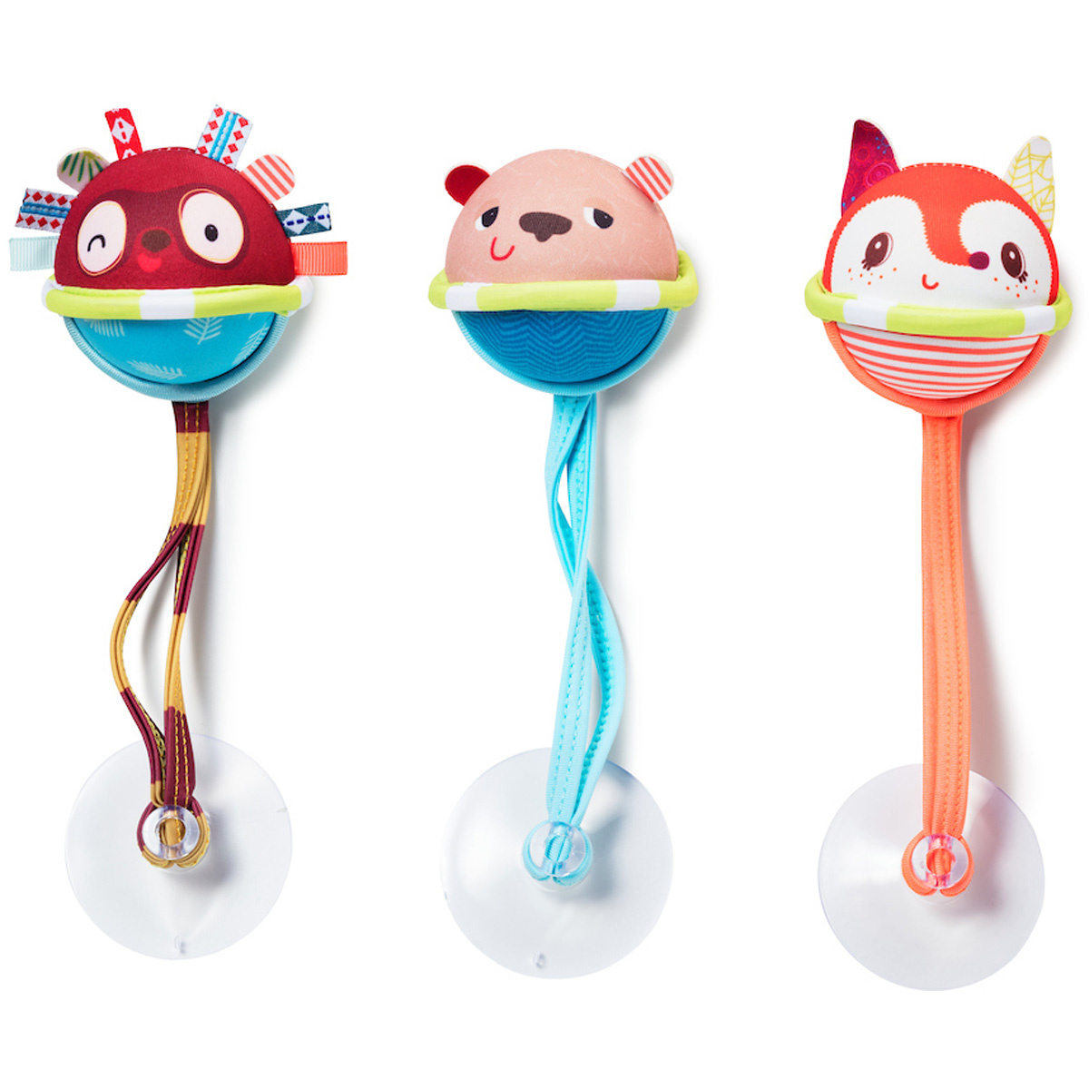 3 badballetjes van neopreen worden met zuignapjes bevestigd in het bad en dansen op het water, vlak voor de baby.