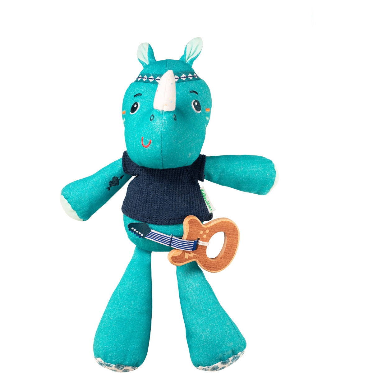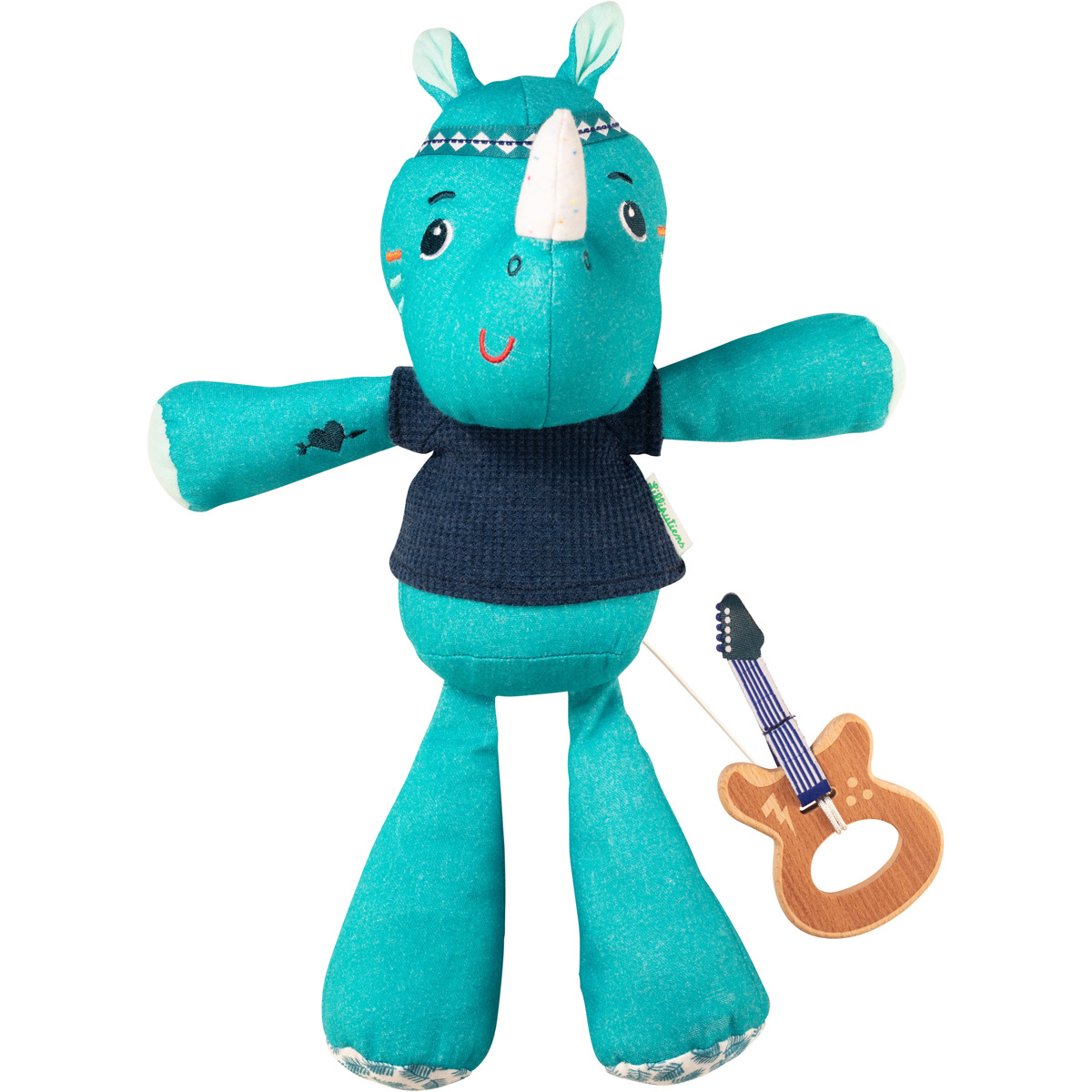 Marius de neushoorn haalt zijn elektrische gitaar boven. Op de tonen van “Light my fire” vergezelt hij stoere kleintjes naar dromenland. Gemaakt van zacht ecologisch katoen. Makkelijk wasbaar op 30°.