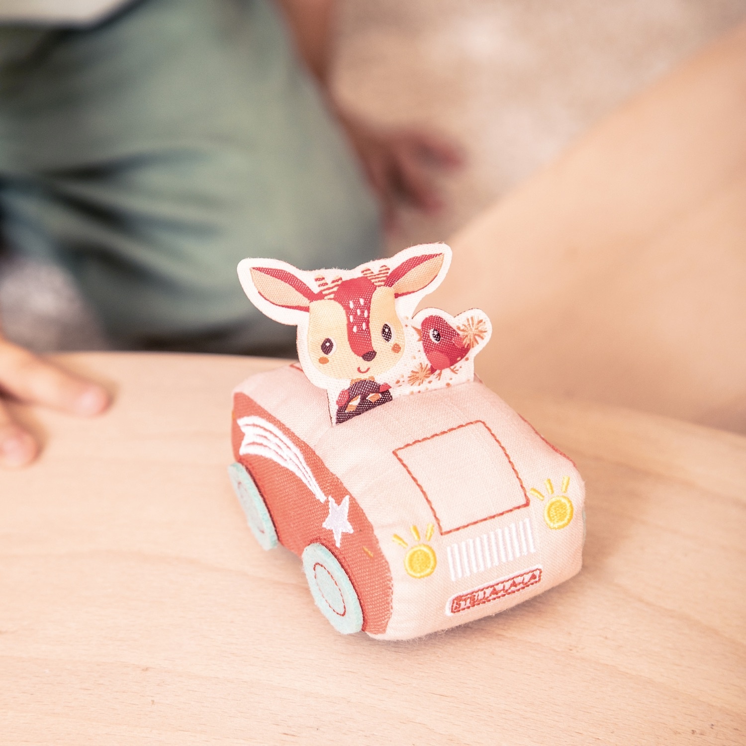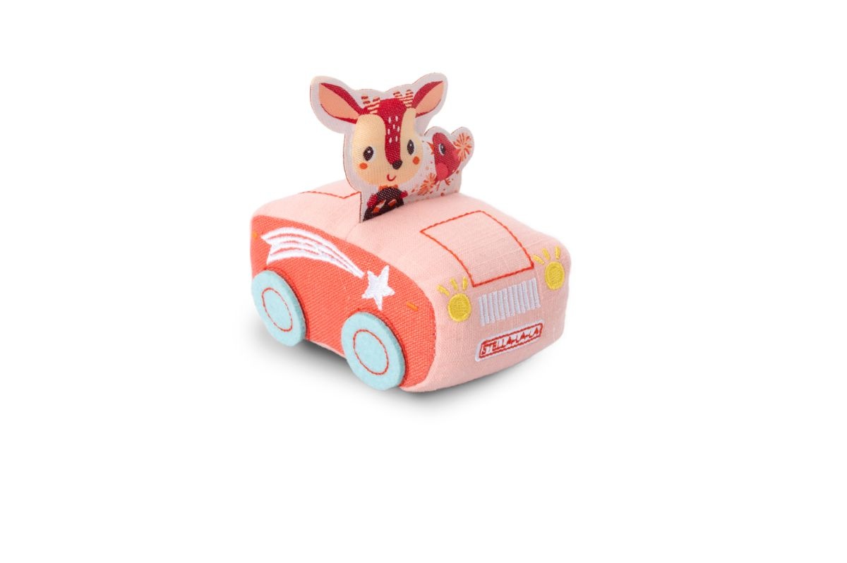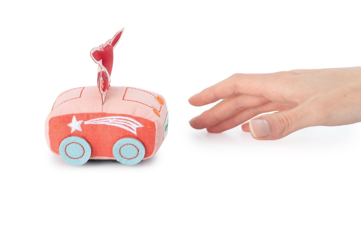 In de auto van Stella speelt een vrolijk deuntje en zwaait Roodborstje met de pompoms. Rij je mee? Deze zachte auto is ideaal voor kleine handjes. Even achteruittrekken en hop, de auto vertrekt.