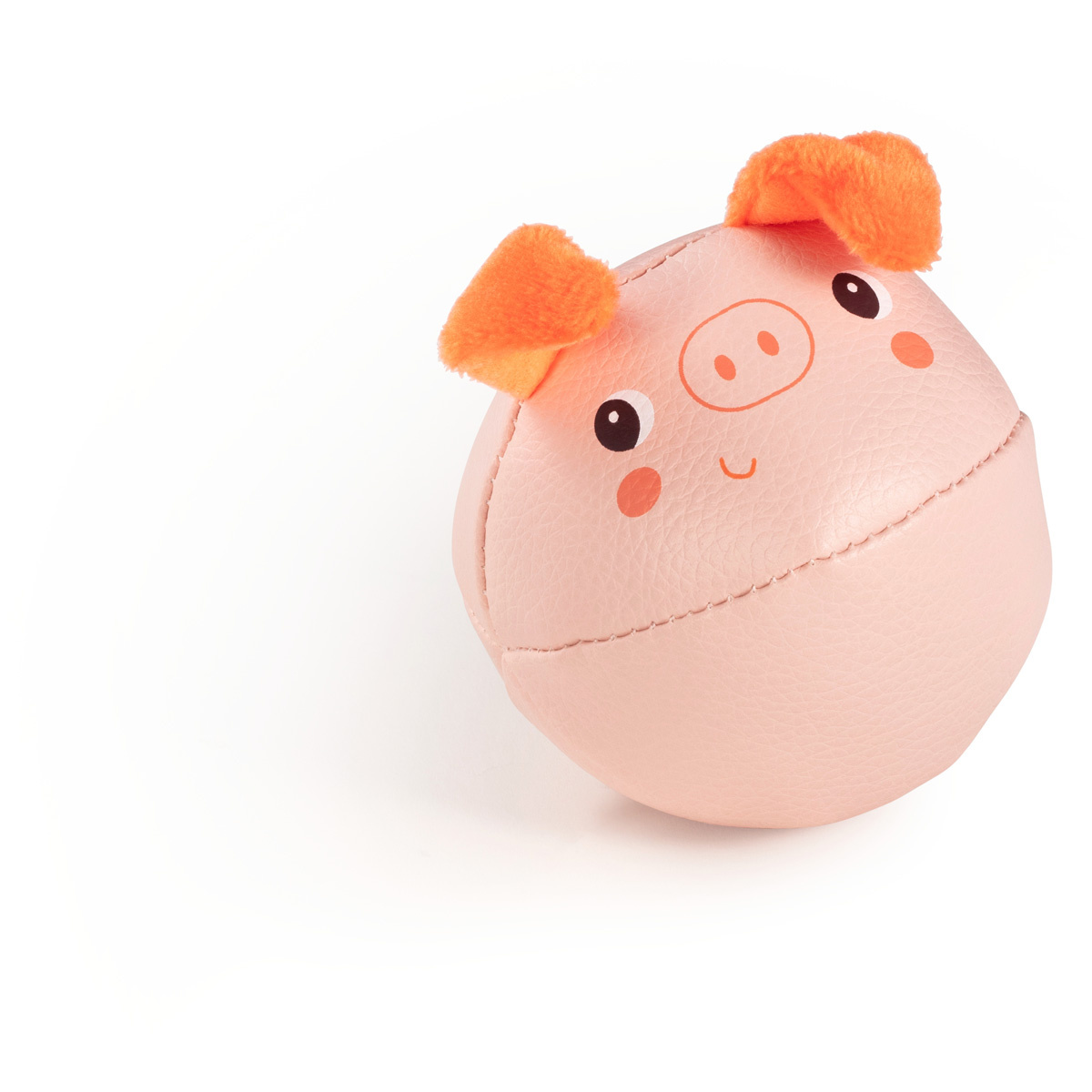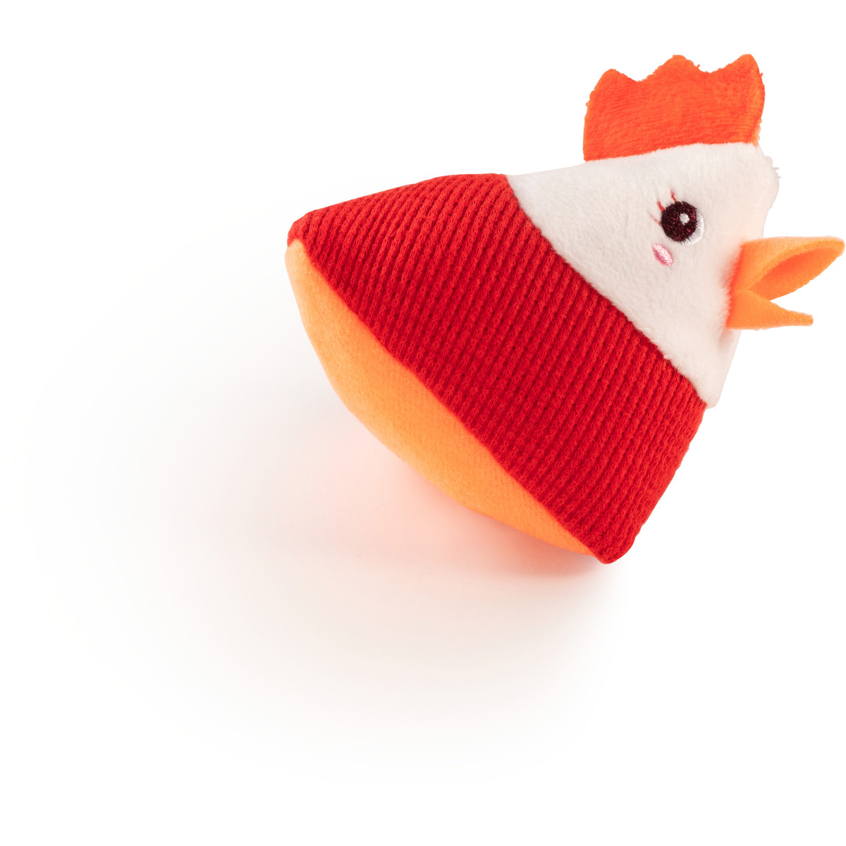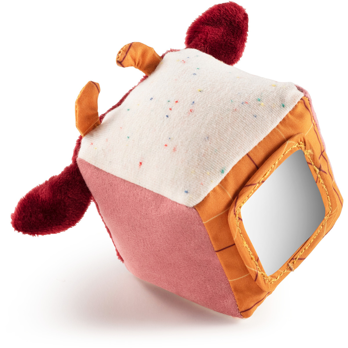 Deze Set van 4 rammelaars bestaat uit een kip, een varken, een schaap en een koe. Elke rammelaar heeft een eigen geometrische vorm, textuur en geluid.
