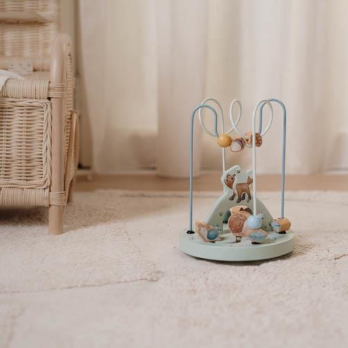 Breng de kralen van links naar rechts in de betoverende wereld van Forest Friends. Onderweg ontmoet je de vriendelijke vos, de egel, het kevertje en de kleine slak, die leven en spelen in het bos. Schuif ze heen en weer om de smakelijke eikels, weelderige bladeren en dennenappels te ontdekken die verscholen liggen tussen de wortels van de bomen. Gebruik je verbeelding en laat het avontuur beginnen! Deze houten activiteitenspiraal biedt een leerzame en betoverende ervaring voor je kindje.