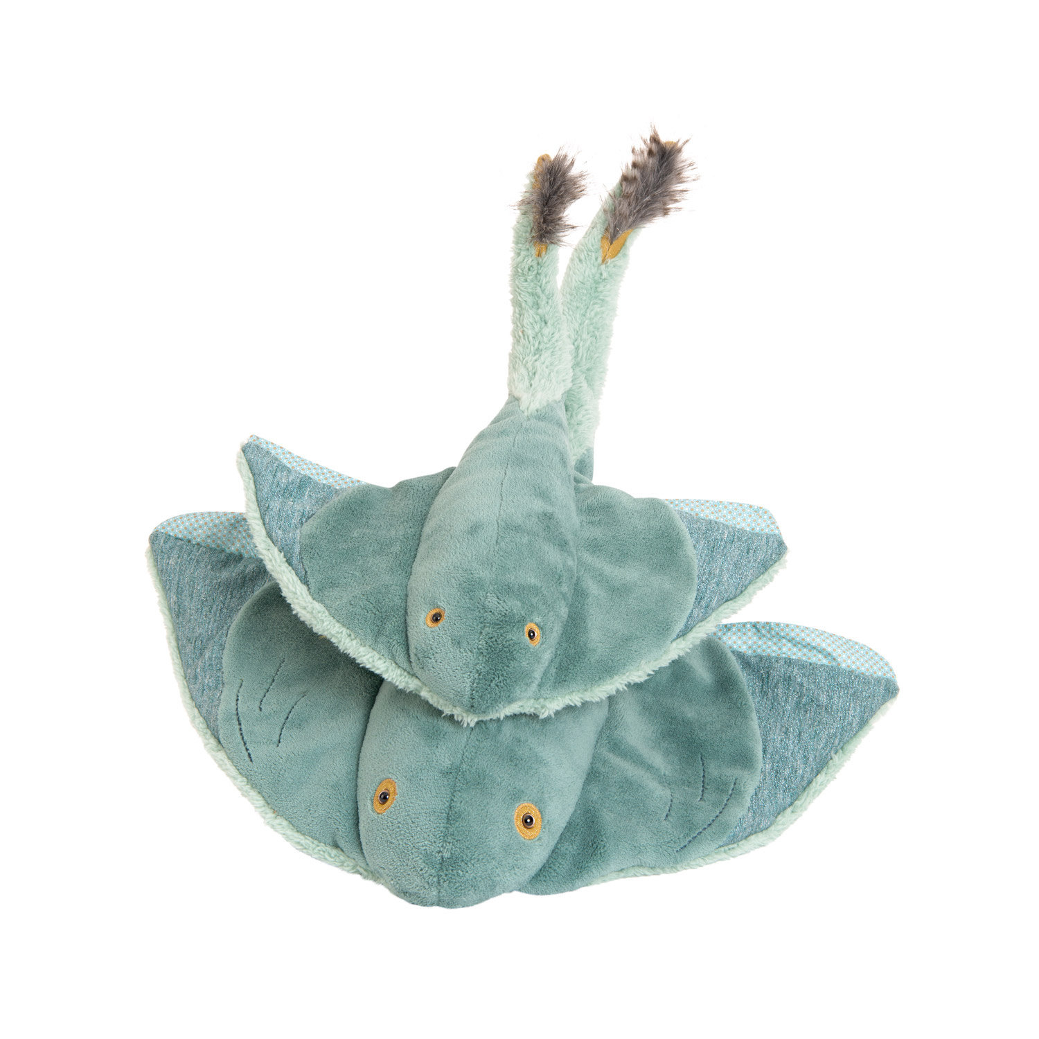 Een grote rog met geweldige vinnen in een mix van stoffen met patronen, koperdraad en korte en ruige vacht! Een perfecte knuffelvriend met zachte ogen omlijst door gouden draad - begeleid door zijn kleine straal.\nMachinewasbaar op 30°C op wolprogramma. Niet in de droger. \n \n64 CM \n \nMateriaal: \nkatoen, polyester, polyamide, acryl, vezels métallisées