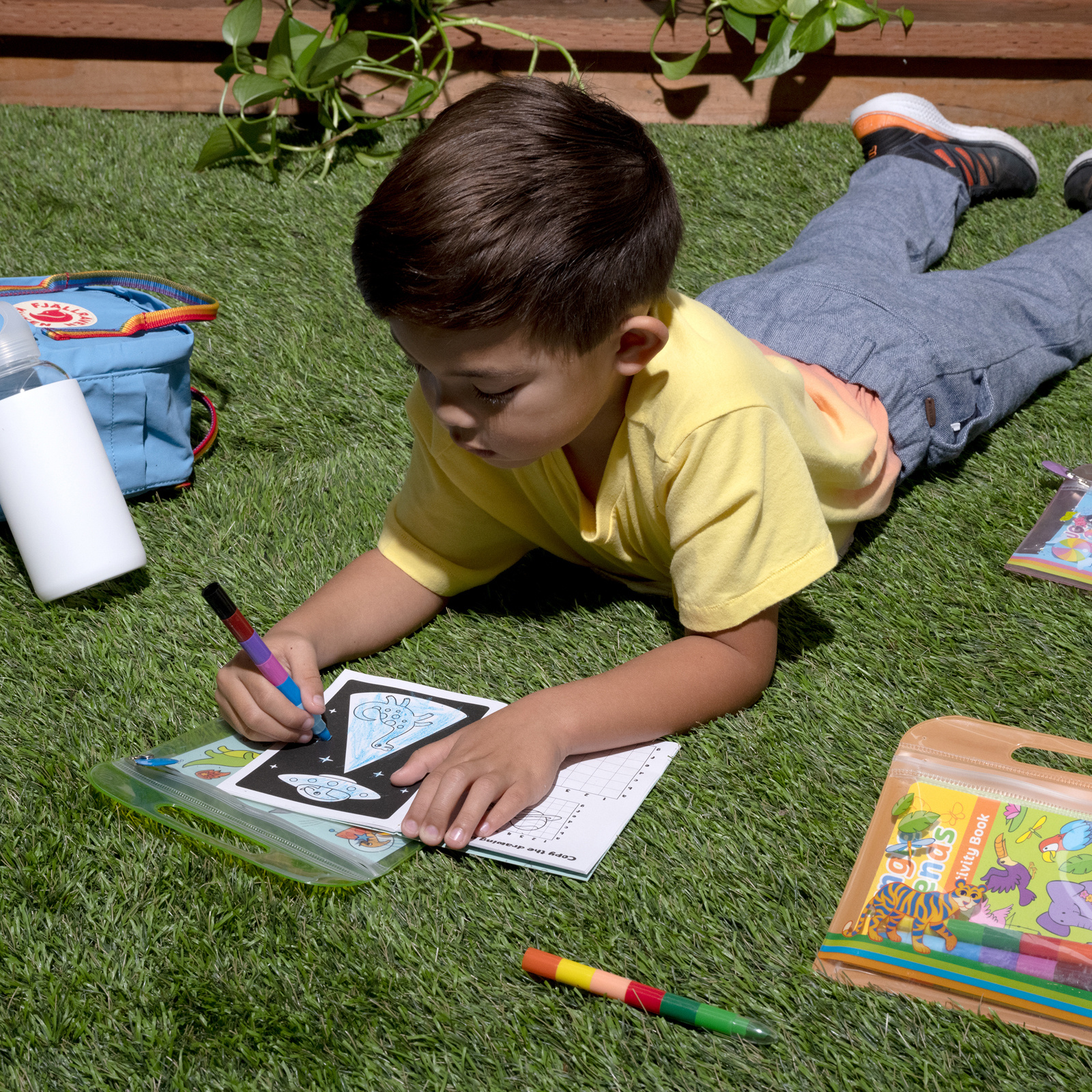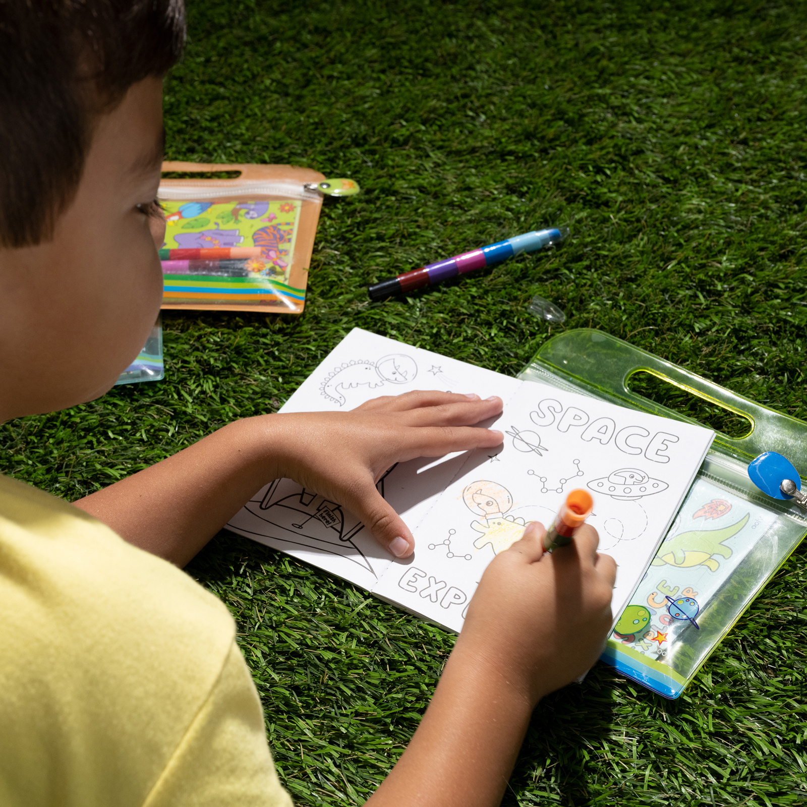 De Mini Traveler kleur- en activiteitenSet bevat een verscheidenheid aan activiteiten om de kleintjes bezig te houden. Dit activiteitenboek van 28 pagina’s heeft pagina’s om in te kleuren, met stickers te spelen, doolhoven op te lossen, woorden te zoeken, de verschillen te zoeken en meer. Ook inbegrepen zijn 2 stapelbare waskrijtjes met 12 verschillende kleuren en 2 stickervellen. Al dit reisplezier zit in de handige draagtas, zodat je hem gemakkelijk kunt inpakken en gebruiken tijdens je reis. Geschikt vanaf 6 jaar.